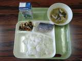本日の給食の献立は、 さごしのごまじょうゆかけ 五目汁 大豆の煮もの ごはん ...