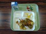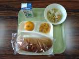 本日の給食の献立は、 豚肉と野菜のスープ煮 変わりピザ みかん 黒糖パン 牛乳...