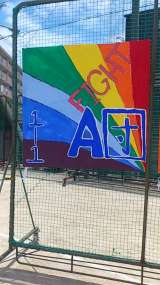 体育大会の取り組みの一環として各学級で応援旗を作成しました。1年生各学級の応援旗...