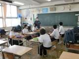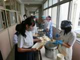 4時間目が終了し、給食の準備に入りました。 三角巾、エプロン姿の係生徒が、手を...