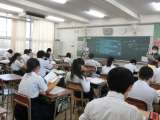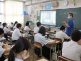 国語、社会、数学の授業です。 国語では文法の学習。 活用形のホワイトボード...