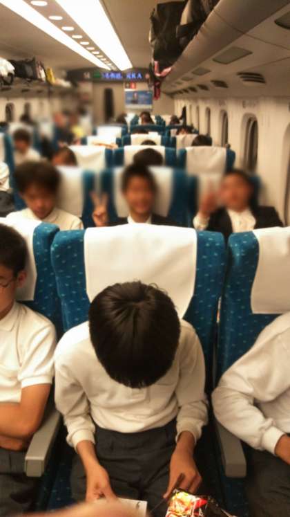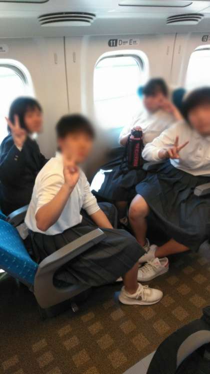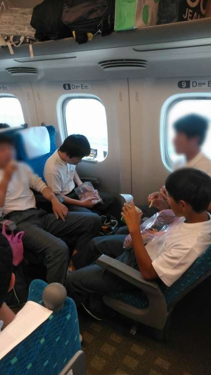 帰りの新幹線内の様子です1。トランプしたりおやつを食べたり話しをしたり、それぞれ楽しんでいます。お土産もたくさんかいました。
