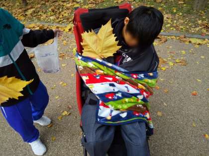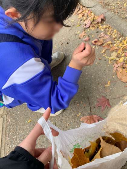 植物園内にあるウォークラリーをしながら、作業の時間に使うものをたくさん見つけました。どんぐり、葉っぱ、小枝など大事に学校まで持ち帰りました。