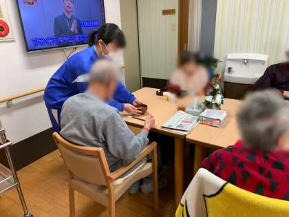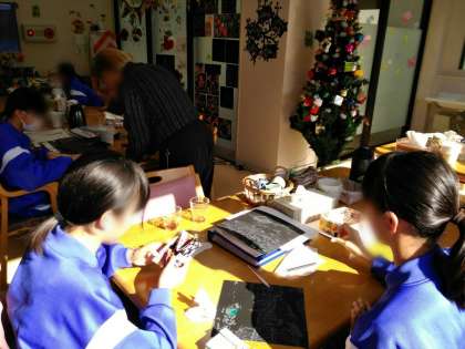 今日は2組の生徒たちが福祉体験学習を行いました。クリスマス飾りを作ったり、昼食の配膳を手伝わせていただいたり、利用者の方々と触れ合うことができました。