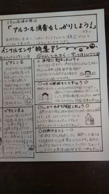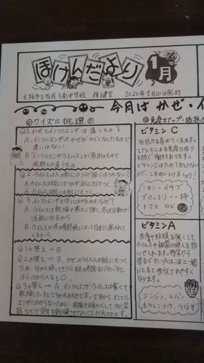 本日「ほけんだより1月号」を生徒の皆さんに配布しました。インフルエンザが流行する時期です。インフルエンザにかからないように、うがい、手洗いを励行しましょう。