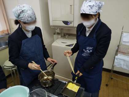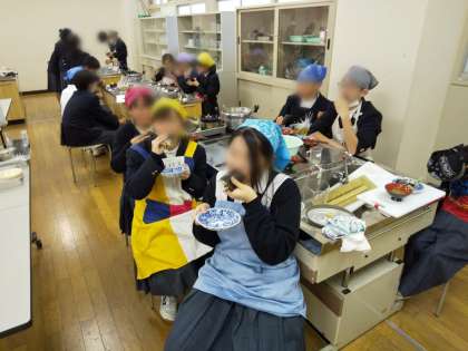 2年生の家庭科では、各クラス調理実習で節分料理を作っています。メニューは、恵方巻きと鰯のつみれ汁です。