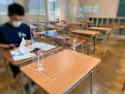 個人面談を行う際に、写真に写っている透明のアクリルシールドを使用しています。