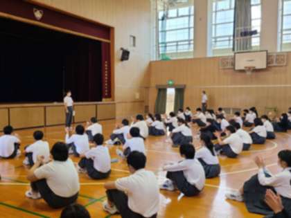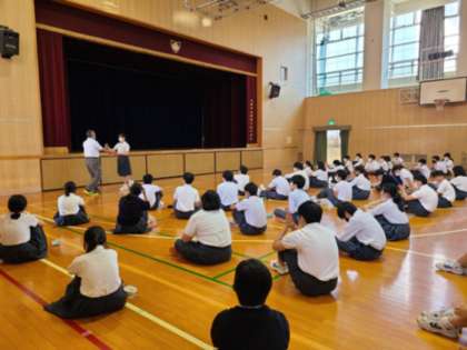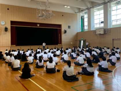 昨年度の学年テーマのサブタイトル、「一色(ひとり)なら描けない虹も仲間となら」でもあったように、「なかま」について、昨年度の学級代表や学年代表の生徒が、皆の前で話をしてくれました。