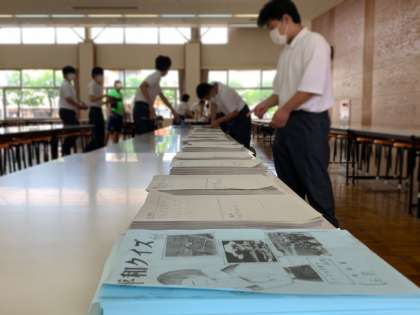 明日の8.6平和登校日に向け、実行委員の生徒が、冊子作りやリハーサル、会場準備等を行ってくれていました。