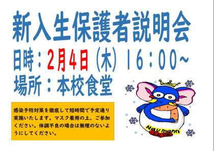 明日2月4日(木)16:00より本校食堂で来年度の新入生保護者説明会を実施いたします。このような時ですので感染予防対策を十分に行い、要点を絞って短時間で行う予定です。