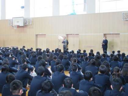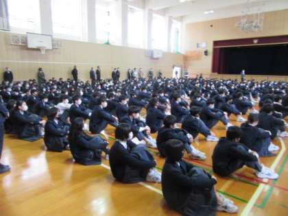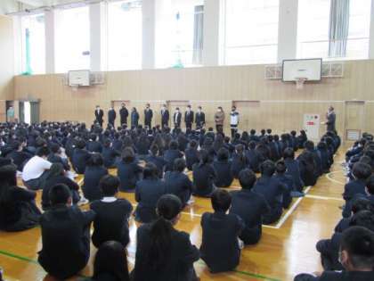 新たに迎えた1年生を含めて、全校生徒で始業式を行いました。みんな真剣に話を聞いていました。