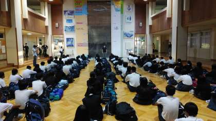 修学旅行の出発式の様子です。コロナの影響で10月に延期になりましたが、無事に当日を迎えることができました。他学年の先生方もたくさん見送りに来てくださいました。