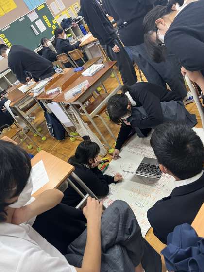 先週の金曜日から取り組み始めた平和活動のしおり・壁新聞づくりですが、去年もたくさん壁新聞を作ってきたので、手際よく各班の色で出来上がってきました。