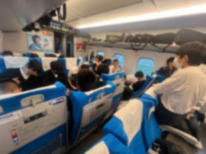 現在、姫路駅から西明石駅を走行中です! 1組男子、仲良くみんなで人狼ゲームをしています。