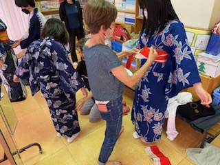 慣れないながらも楽しそうに着こなし、2回目の本日は、着付けを覚えた生徒が初めて着る生徒の着付けを手伝うなど、大したものです!