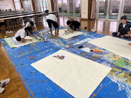 模造紙貼り付けから下書き、色塗りとものすごいペースで制作しています。