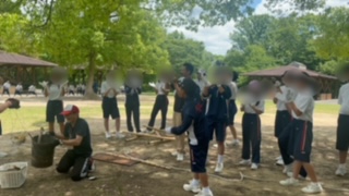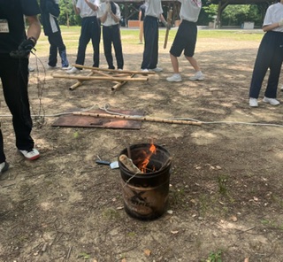 『1.2 っ 1.2っ!』掛け声大きく息合わせて(中心の火種の様子)火がついた瞬間!全クラス火起こし成功!この火を使って美味しいカレーを作りましょう!