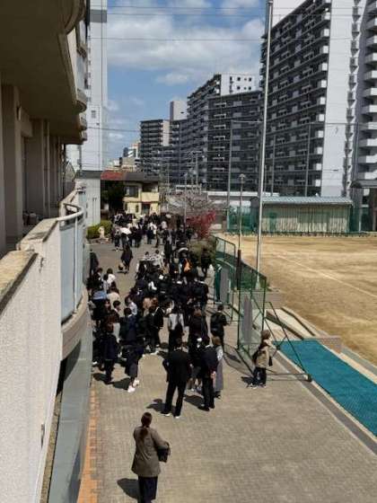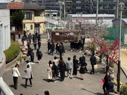 すべての活動を終え、桜の木の下や正門の看板と一緒に写真撮影をしながら帰っていきます。