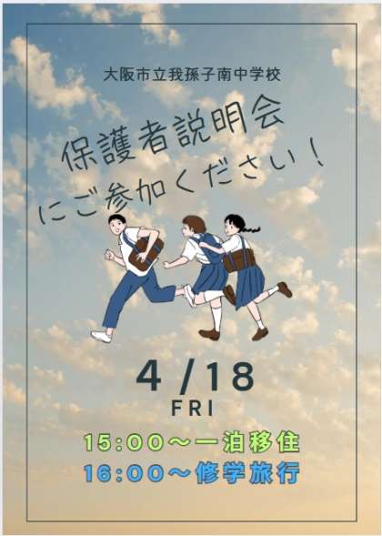 さて、3年生、1年生の保護者の皆様を対象に泊行事に向けての説明会を実施いたします。ご多用とは存じますが、ご参加くださいますようお願い申しあげます。