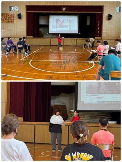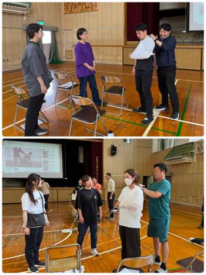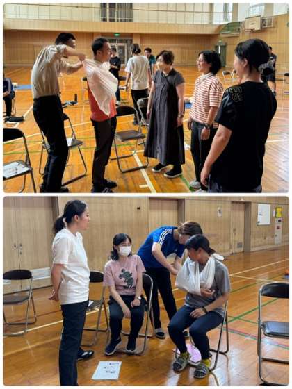 続いて養護教諭よりケガや骨折の際に利活用する三角巾の使用方法について講習があり、参加者で体験してもらいました。