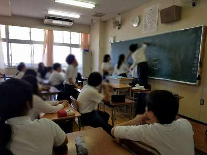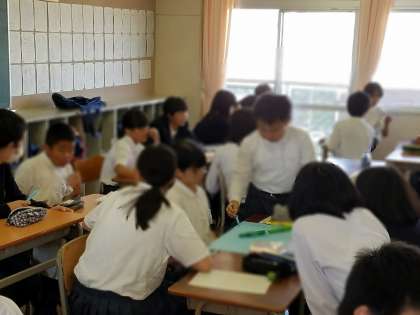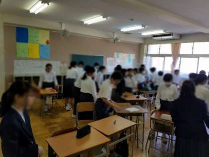 座席の隊形がかわり、2人もしくは3人が机をくっつけて授業を受けます。