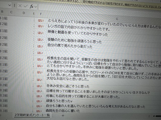 受験生にとっては、とても大事な冬休みですし、1.2年生にとっても今後を見通しての冬休みと理解をしてもらうため、目的意識の大切さについて講話をしました。Canvaや動画を活用して伝えた感想を集約し、今後にフィードバックしたいと思います。