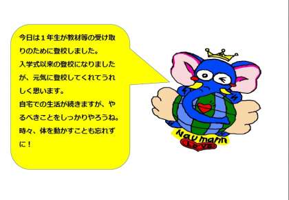 さて、すでに連絡しております通り4/21(火)〜4/23(木)を学習課題配布日とします。当日については短時間での配布とするため、今までの課題の回収は行いません。課題の提出については学校再開後に指示をいたします。ご理解、ご協力のほどよろしくお願いします。