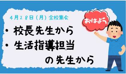 新しい一週間が始まる全校集会での挨拶は、自分を励ますように元気よくしましょう。また、今年度は、校長先生以外の先生方に講話をしてもらうことにします。月に一度、どなたのお話が聴けるか楽しみにしてほしいです。