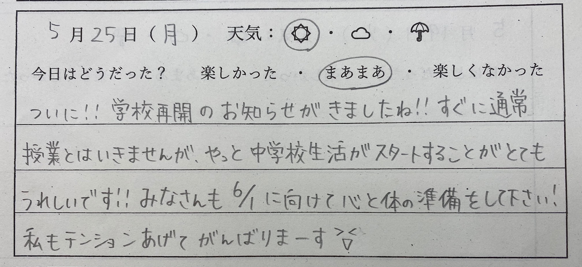 今週火曜の登校日に比べて、生徒たちの表情も少し和らぎ、学校生活に戻る準備が少しずつ出来てきているような感じがしました。