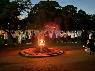 燃え上がる炎を囲み、クイズゲームや中村先生による『猛獣狩り』、クラス対抗歌合戦など! -