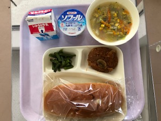 【煮こみハンバーグ コーンスープ さんどまめのサラダ ヨーグルト パン 牛乳】