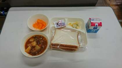 【パン 牛乳 ビーフシチュー キャベツのピクルス ミカンの缶詰 いちごジャム】
