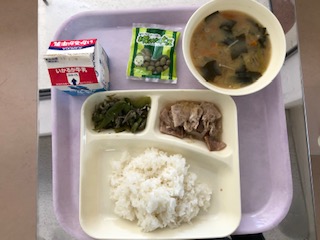 【豚肉のおろしじょうゆかけ みそ汁 じゃこピーマン まっ茶大豆 米飯 牛乳】