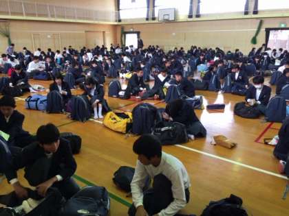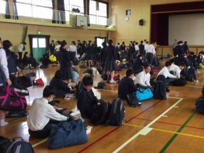 3年生は3・4時間目に修学旅行の荷物確認や事前指導を体育館で行いました。