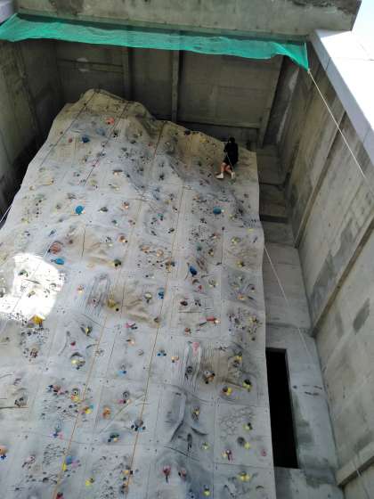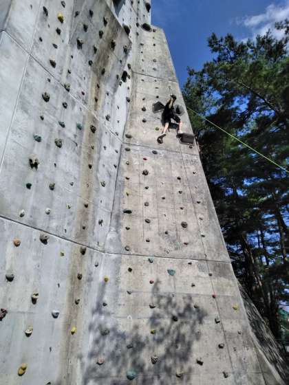 クライミング中の写真です。足で蹴って、体を上げて、つかむのがこつだそうです。下を見るとこわいと言いながら、果敢に挑戦していました。よろしくお願いします。