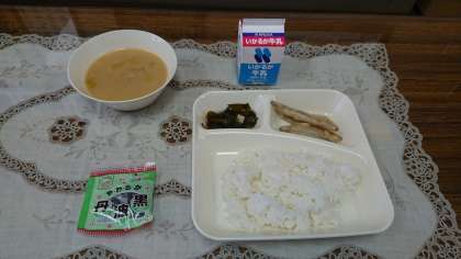 【ごはん 牛乳 きびなごてんぷら 豚汁 わかたけ煮 ソフト黒豆】