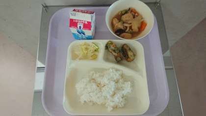 【ごはん 牛乳 ちくわのいそべあげ 鶏肉と一口がんもの煮物 あっさりキャベツ】