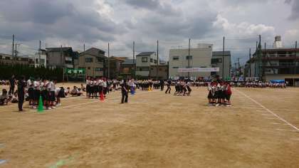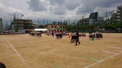 一年生の学年種目、むかで競争です。1年全員が出演しています。午前中最後の競技です。