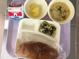 【かぼちゃのクリームシチュー ミックス海そうのサラダ りんご 黒糖パン 牛乳】