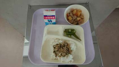 【ごはん 牛乳 豚肉と馬鈴薯の煮物 オクラの甘酢あえ ツナっ葉いため】