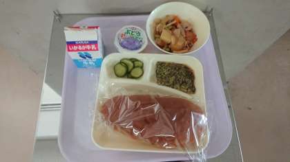 【黒糖パン 牛乳 もずく入りヒラヤーチー 豚肉と烏賊の煮物 あっさりきゅうり 葡萄ゼリー】