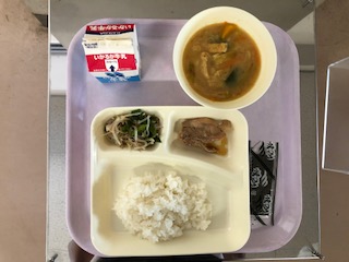 【鶏肉の照り焼き 野菜炒め 焼きのり みそ汁 ごはん 牛乳】