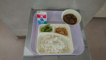 【牛乳 ごはん マーボー茄子 もやしのごま酢あえ 枝豆】