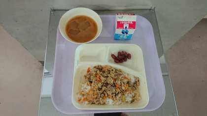 【他人丼 牛乳 とうがんの味噌汁 金時豆の煮物】