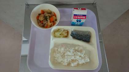 【ごはん 牛乳 さごしの塩焼き じゃがいもと一口がんもの煮物 キャベツのおひたし】