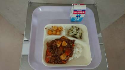 【ハヤシライス 牛乳 キャベツのひじきドレッシング さくらんぼ】