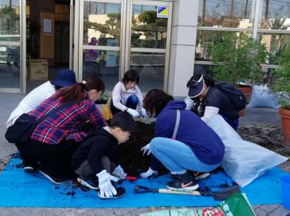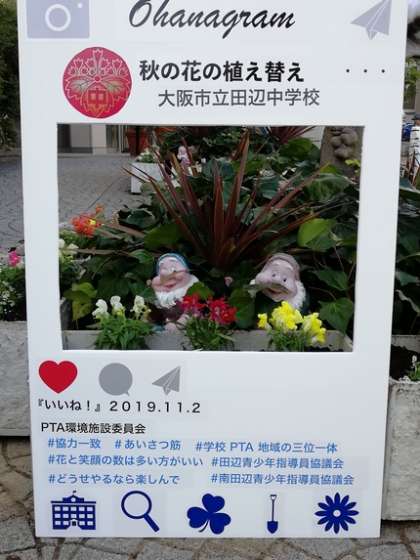 快晴のお天気に恵まれた中、PTA環境委員の皆さんを中心に花の植え替え作業を行いました。今回はプランターをひっくり返す作業など力仕事がたくさんあるので、南田辺・田辺地域の青少年指導員のお父さんたちにもお手伝いをいただきました。昼までかかるかな?と思っていましたが、それぞれが手際よく作業してくださり早く終えることが出来ました。本当にありがとうございました。とても綺麗になり、火曜日に登校してくる生徒たちの喜ぶ顔が目に浮かびます。