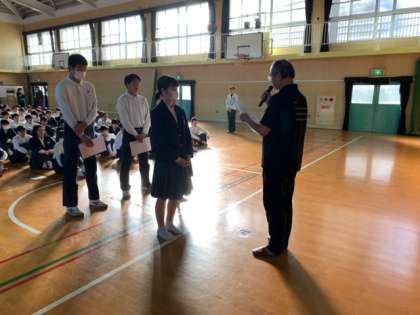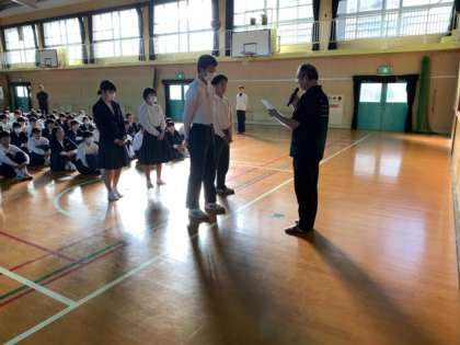 本日の3年生学年集会は、専門委員会から今月の目標の発表と先週行われた球技大会の表彰を行いました。