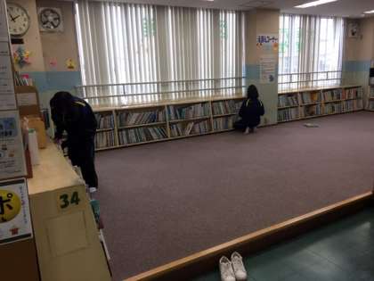 東住吉図書館の様子です。返却された本を棚に戻しています。中には重たい本や大きな本も。頑張ってください♪