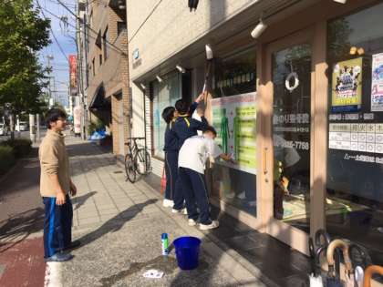 みのり整骨院での様子です。お店の窓の清掃を行っていました。仕事はどこでもなんでもまずは掃除から!頑張ってください♪